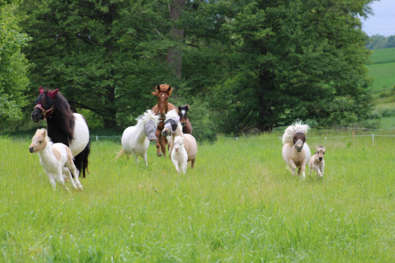 Über den Sommer ziehen wir in den Nachbarort, Dort haben wir 2,5 Hektar Weidefläche mit Bachlauf, wo die Ponys einfach nur Pferd sein können.